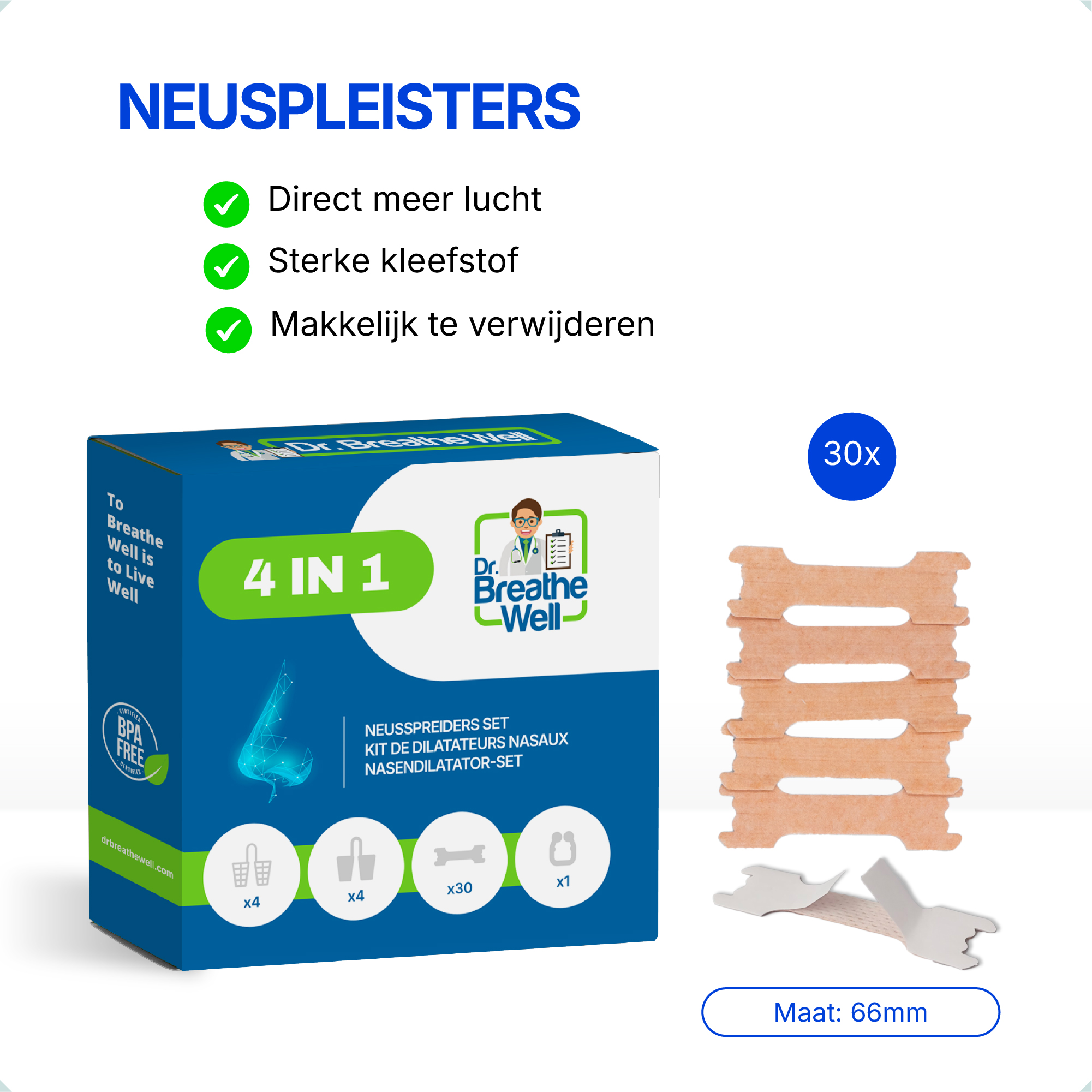 De neuspleisters van Dr. Breathe Well helpen bij het openhouden van de neusgaten en voorkomen zo een geforceerde ademhaling door de mond.