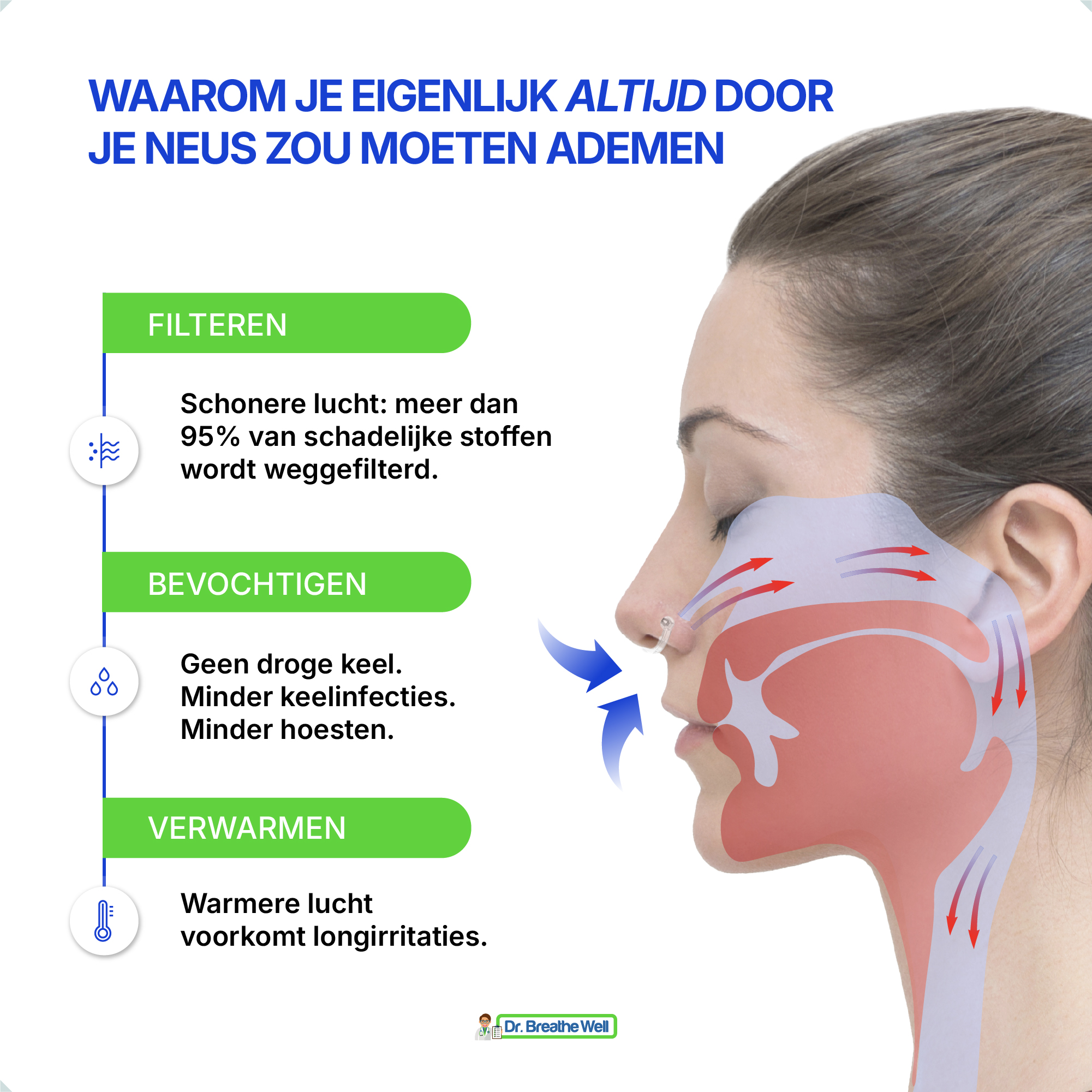 Doordat je neusgaten wijder openstaan duurt het langer voordat je door je mond gaat ademen. Hierdoor blijft de lucht gefilterd en krijg je zuiverdere zuurstof binnen.