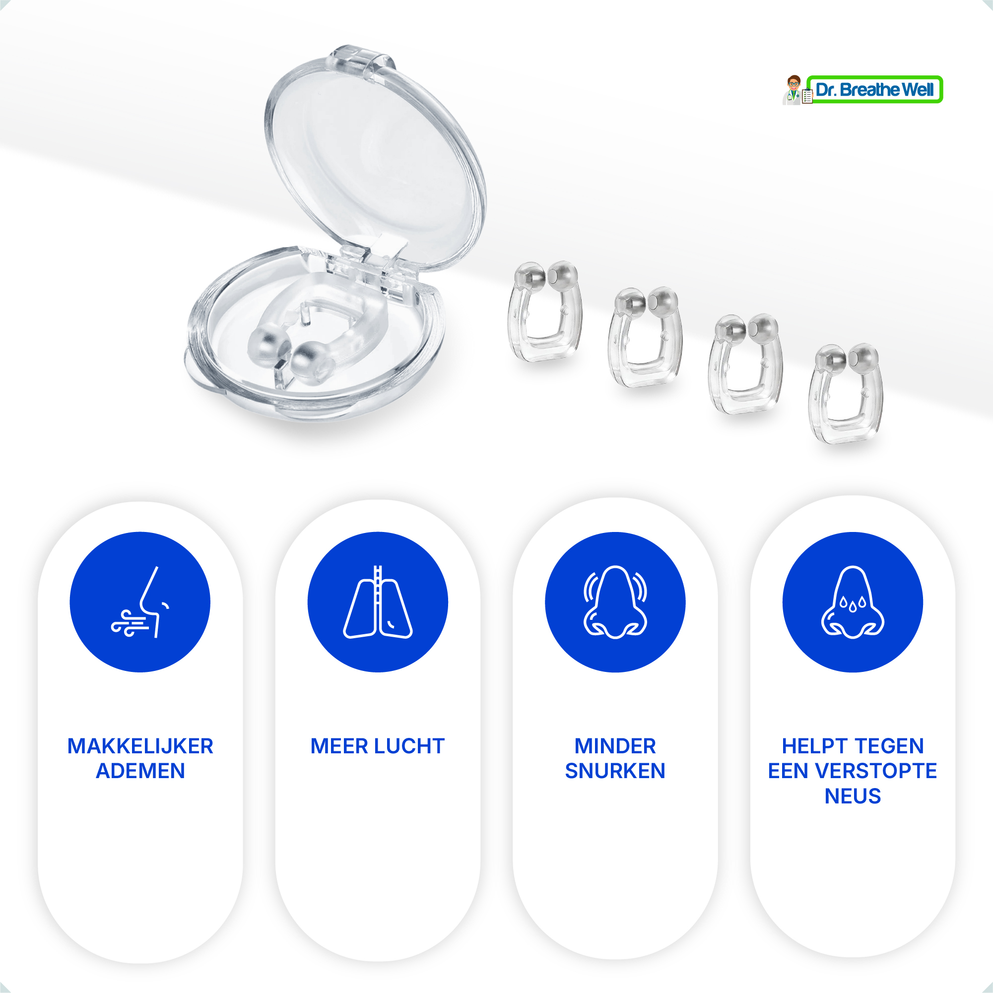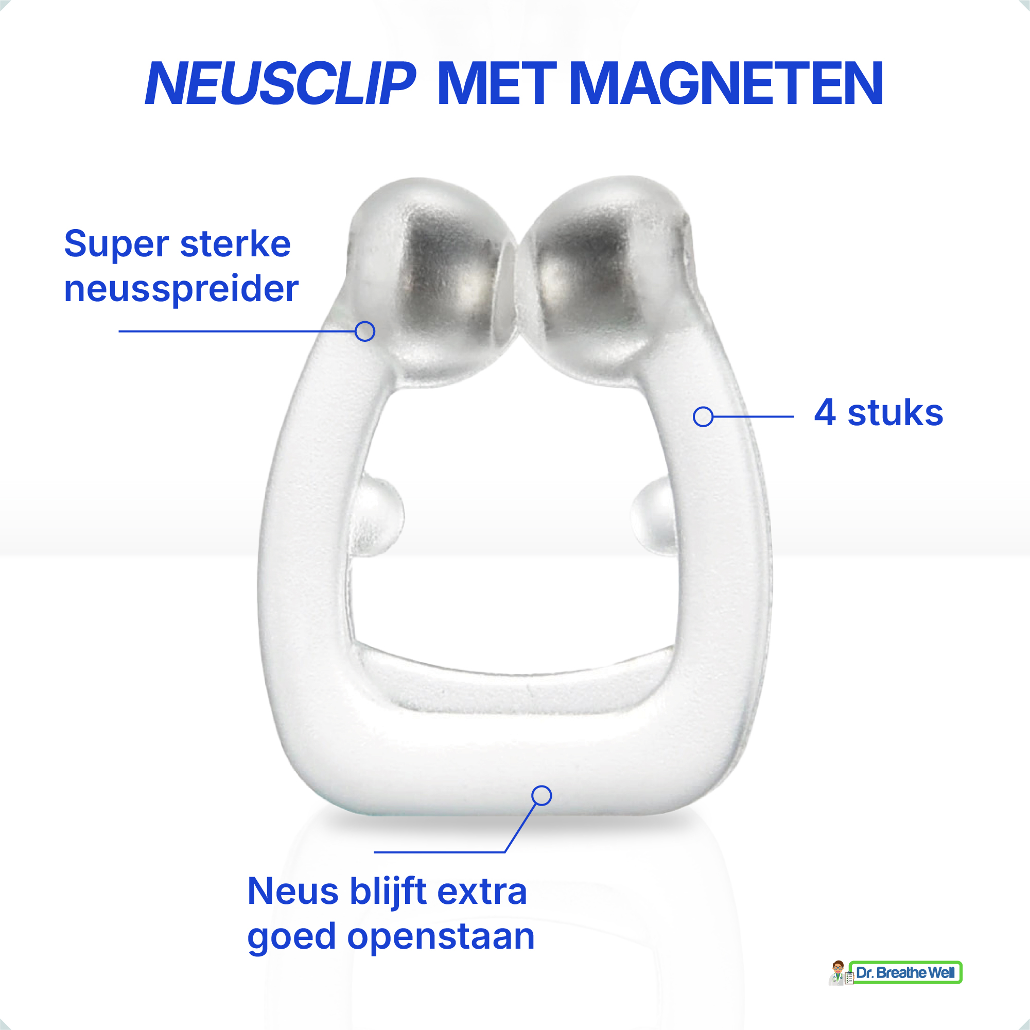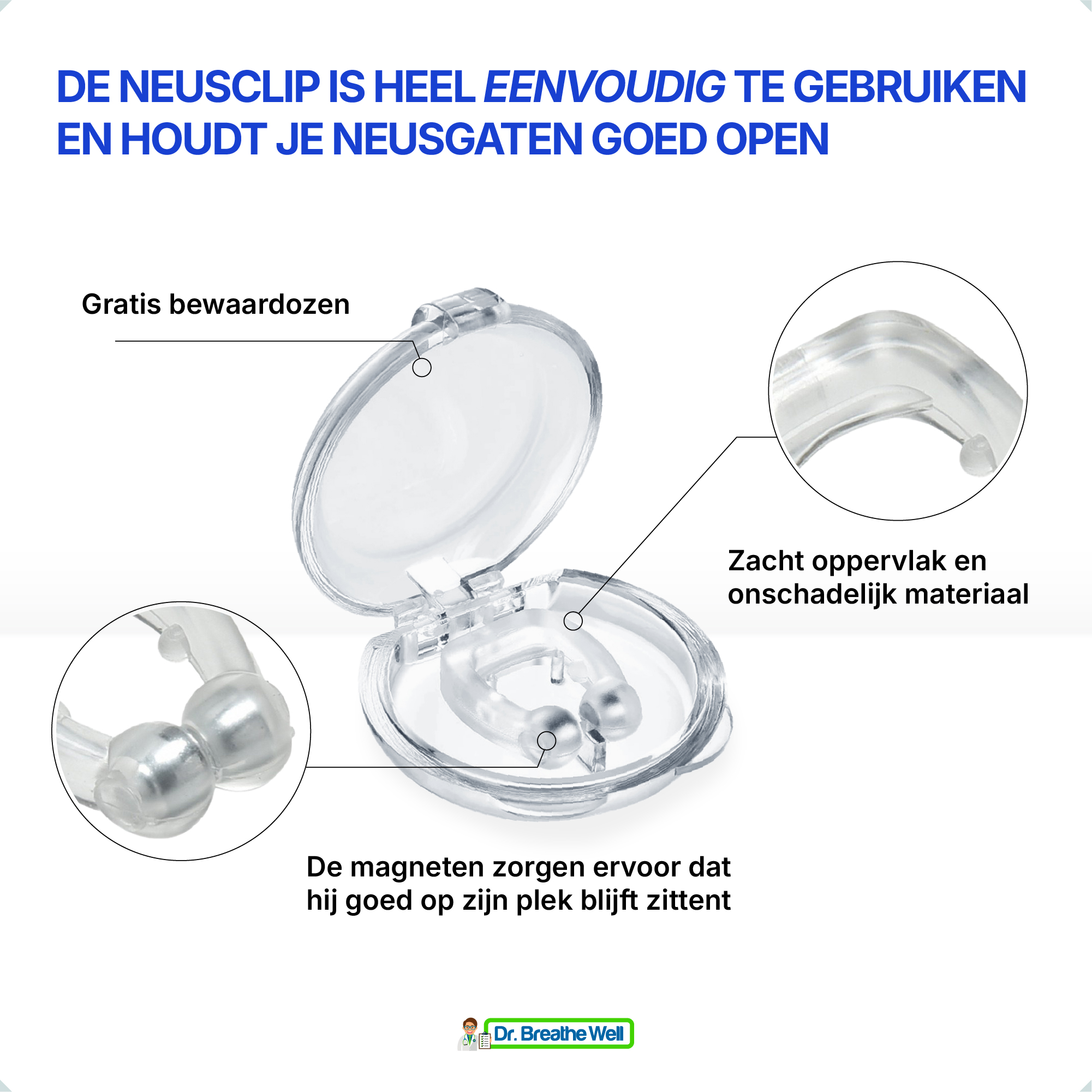 De magnetische neusclip verbetert de luchttoevoer door de neus. De neusclip zorgt ervoor dat tijdens de slaap je neusgaten beter open blijven staan. Je neusgaten blijven hierdoor goed openstaan en je ademhaling verloopt soepeler. Snurken door nasale blokkades wordt hierdoor verminderd of je zult zelfs helemaal stoppen met snurken.