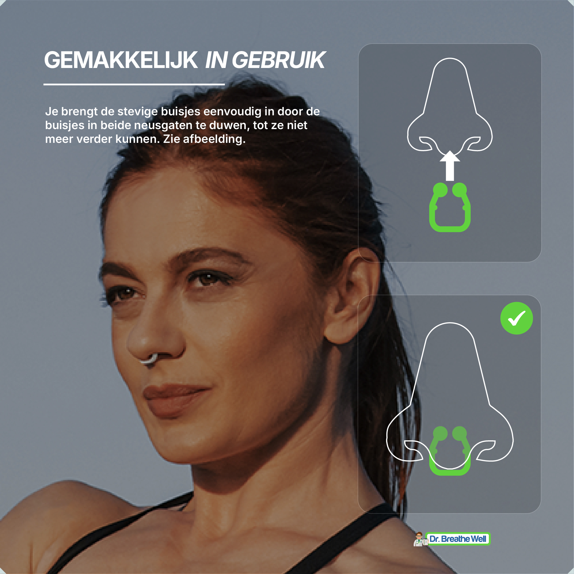 Dr. Breathe Well verbetert de luchttoevoer door de neusgaten. De neusklem zorgt ervoor dat je neusgaten beter open blijven staan, waardoor de ademhaling soepeler verloopt. Hierdoor kun je vrijer ademen en krijg je meer zuurstof binnen.